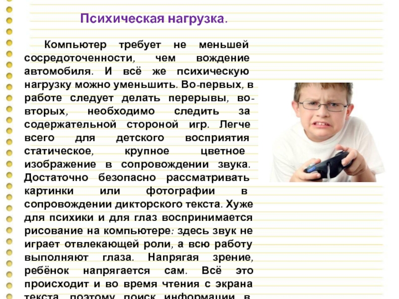 Компьютер требует не меньшей сосредоточенности, чем вождение автомобиля. И всё же психическую нагрузку можно уменьшить. Во-первых, в работе следует делать перерывы, во-вторых, необходимо следить за содержательной стороной игр. Легче всего для детского восприятия статическое, крупное цветное изображение в сопровождении звука. Достаточно безопасно рассматривать картинки или фотографии в сопровождении дикторского текста. Хуже для психики и для глаз воспринимается рисование на компьютере: здесь звук не играет отвлекающей роли, а всю работу выполняют глаза. Напрягая зрение, ребёнок напрягается сам. Всё это происходит и во время чтения с экрана текста, поэтому поиск информации в Интернете нужно дозировать. Ну и, наконец, настоящие вредители – игры, содержащие движущееся на высокой скорости изображение и мелкие элементы.