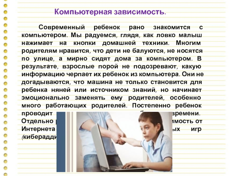 Современный ребенок рано знакомится с компьютером. Мы радуемся, глядя, как ловко малыш нажимает на кнопки домашней техники. Многим родителям нравится, что дети не балуются, не носятся по улице, а мирно сидят дома за компьютером. В результате, взрослые порой не подозревают, какую информацию черпает их ребенок из компьютера. Они не догадываются, что машина не только становится для ребенка няней или источником знаний, но начинает эмоционально заменять ему родителей, особенно много работающих родителей. Постепенно ребенок проводит за компьютером все больше времени. Отдельно различают психологическую зависимость от Интернета (сетеголизм) и компьютерных игр (кибераддикция).