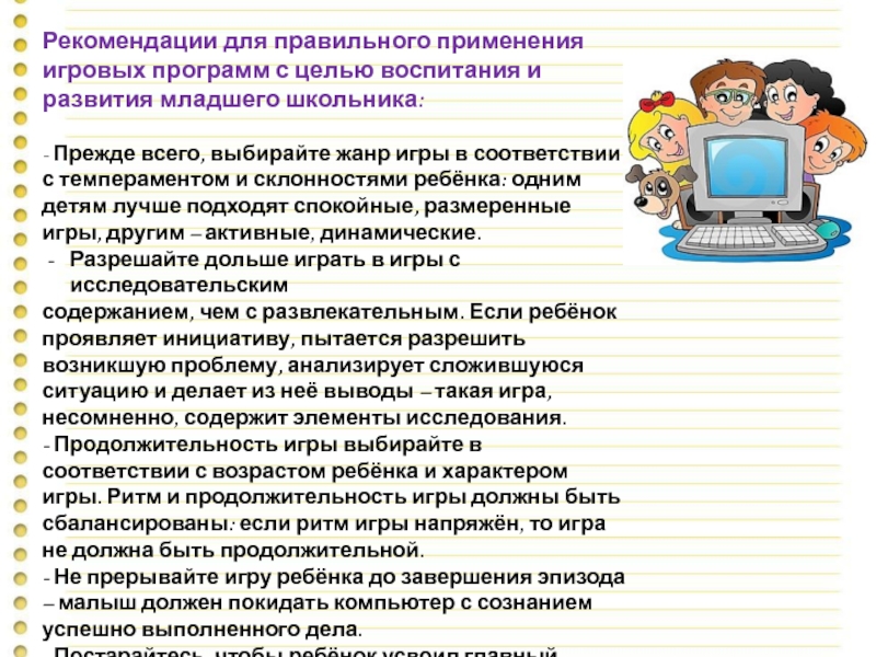 Слайд 11Рекомендации для правильного применения игровых программ с целью воспитания и развития