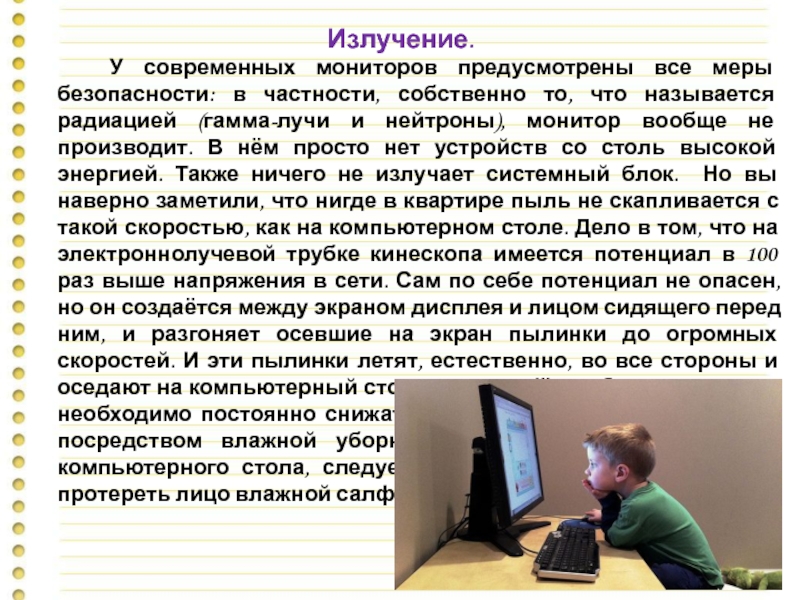 У современных мониторов предусмотрены все меры безопасности: в частности, собственно то, что называется радиацией (гамма-лучи и нейтроны), монитор вообще не производит. В нём просто нет устройств со столь высокой энергией. Также ничего не излучает системный блок. Но вы наверно заметили, что нигде в квартире пыль не скапливается с такой скоростью, как на компьютерном столе. Дело в том, что на электроннолучевой трубке кинескопа имеется потенциал в 100 раз выше напряжения в сети. Сам по себе потенциал не опасен, но он создаётся между экраном дисплея и лицом сидящего перед ним, и разгоняет осевшие на экран пылинки до огромных скоростей. И эти пылинки летят, естественно, во все стороны и оседают на компьютерный стол и лицо ребёнка. Следовательно, необходимо постоянно снижать количество пыли в помещении посредством влажной уборки. А ребёнка, вставшего из-за компьютерного стола, следует умыть прохладной водой или протереть лицо влажной салфеткой.