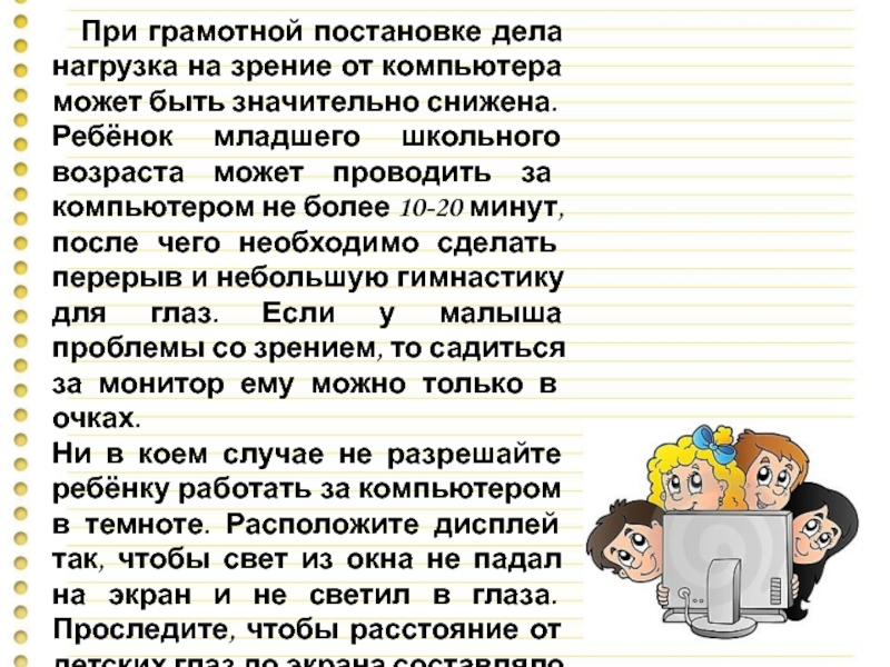 Ни в коем случае не разрешайте ребёнку работать за компьютером в темноте. Расположите дисплей так, чтобы свет из окна не падал на экран и не светил в глаза. Проследите, чтобы расстояние от детских глаз до экрана составляло 50-70 см.
