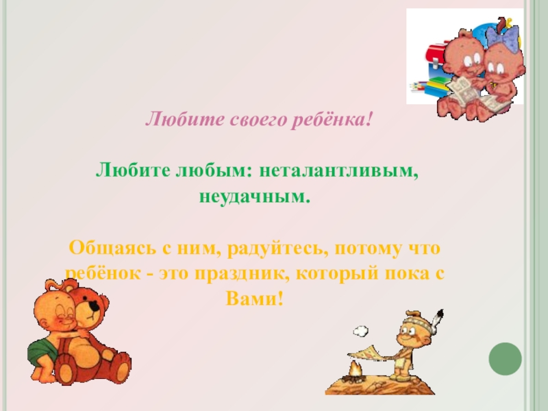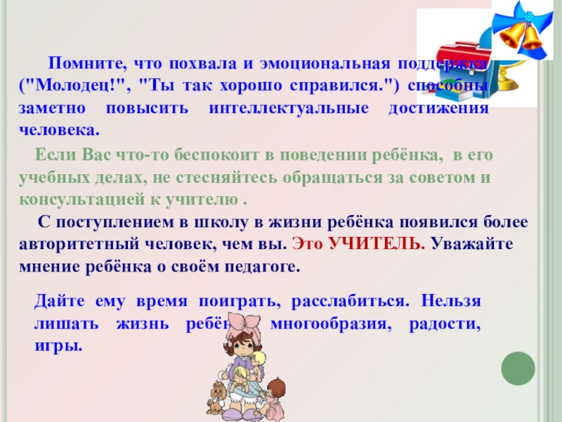Помните, что похвала и эмоциональная поддержка ("Молодец!", "Ты так хорошо справился.") способны заметно повысить интеллектуальные достижения человека.