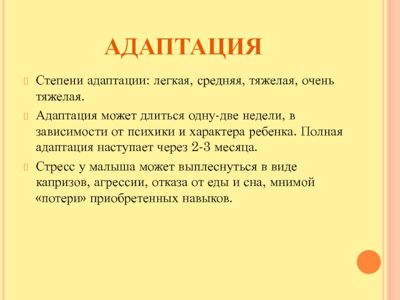 АДАПТАЦИЯСтепени адаптации: легкая, средняя, тяжелая, очень тяжелая.Адаптация может длиться одну-две недели, в зависимости от психики и характера