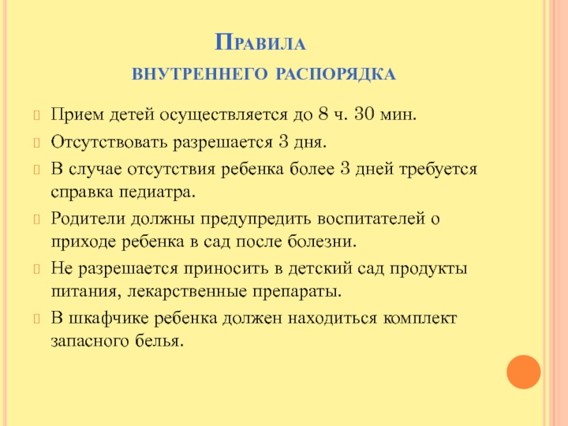 Правила  внутреннего распорядкаПрием детей осуществляется до 8 ч. 30 мин.Отсутствовать разрешается 3 дня.В случае отсутствия ребенка