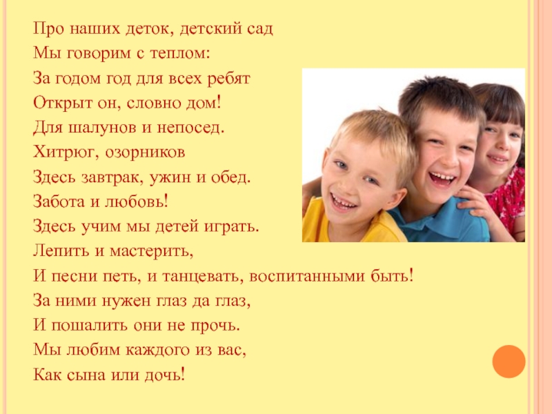 Про наших деток, детский садМы говорим с теплом:За годом год для всех ребятОткрыт он, словно дом!Для шалунов