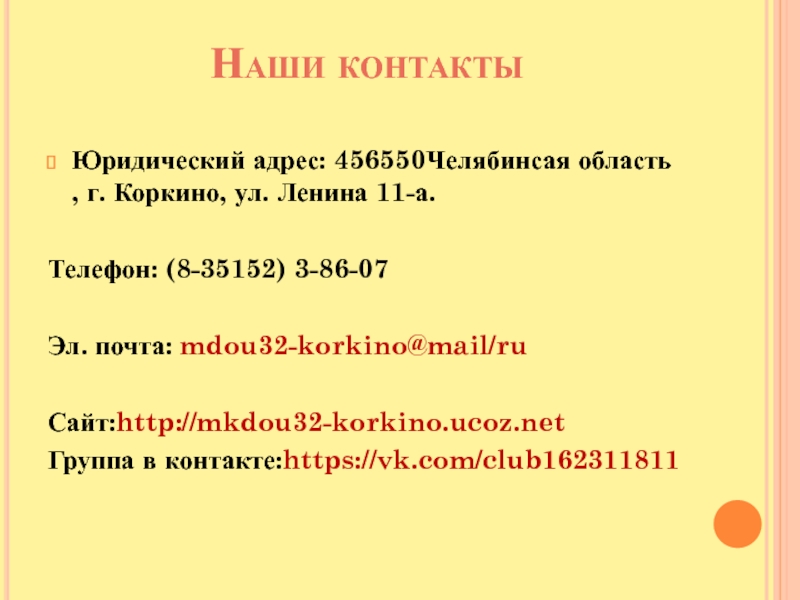 Наши контактыЮридический адрес: 456550Челябинсая область , г. Коркино, ул. Ленина 11-а.Телефон: (8-35152) 3-86-07Эл. почта: mdou32-korkino@mail/ruСайт:http://mkdou32-korkino.ucoz.netГруппа в контакте:https://vk.com/club162311811