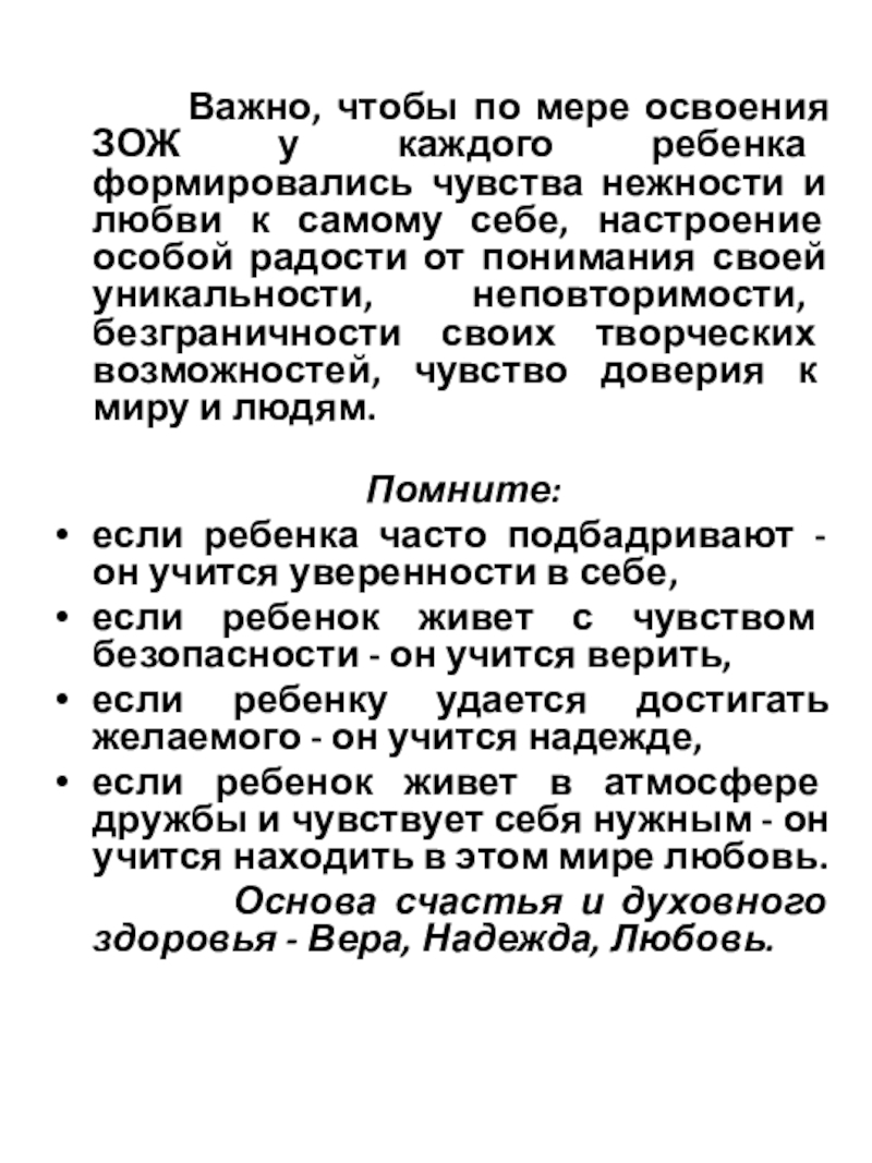 ЗОЖ у каждого ребенка формировались чувства нежности и любви к самому себе, настроение особой радости от понимания своей уникальности, неповторимости, безграничности своих творческих возможностей, чувство доверия к миру и людям.