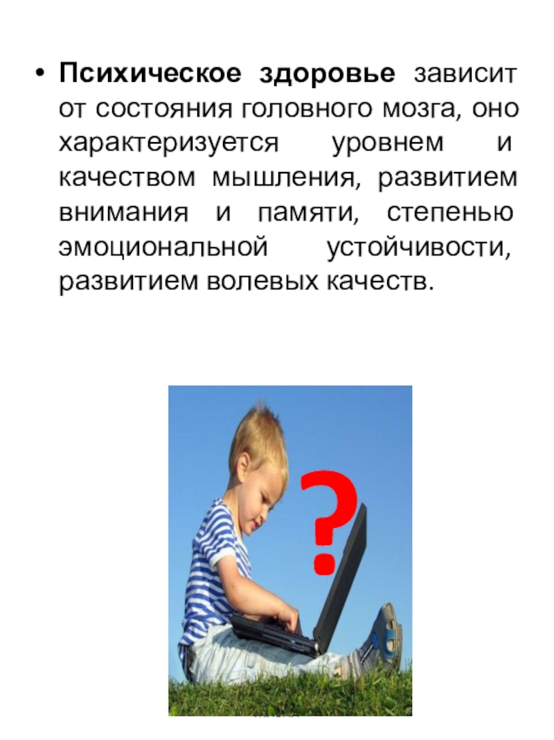 Слайд 6Психическое здоровье зависит от состояния головного мозга, оно характеризуется уровнем и