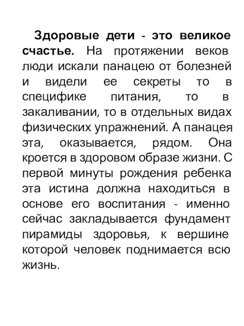 люди искали панацею от болезней и видели ее секреты то в специфике питания, то в закаливании, то в отдельных видах физических упражнений. А панацея эта, оказывается, рядом. Она кроется в здоровом образе жизни. С первой минуты рождения ребенка эта истина должна находиться в основе его воспитания - именно сейчас закладывается фундамент пирамиды здоровья, к вершине которой человек поднимается всю жизнь.