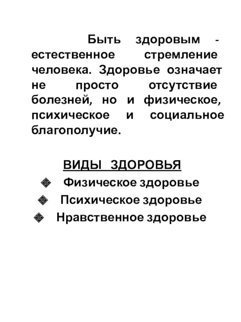 Слайд 4 Быть здоровым - естественное стремление человека. Здоровье означает