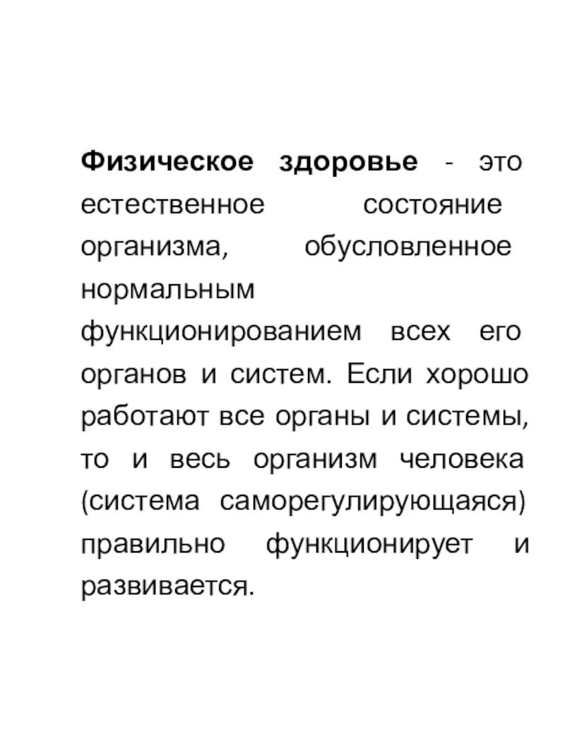 Слайд 5Физическое здоровье - это естественное состояние организма, обусловленное нормальным функционированием всех
