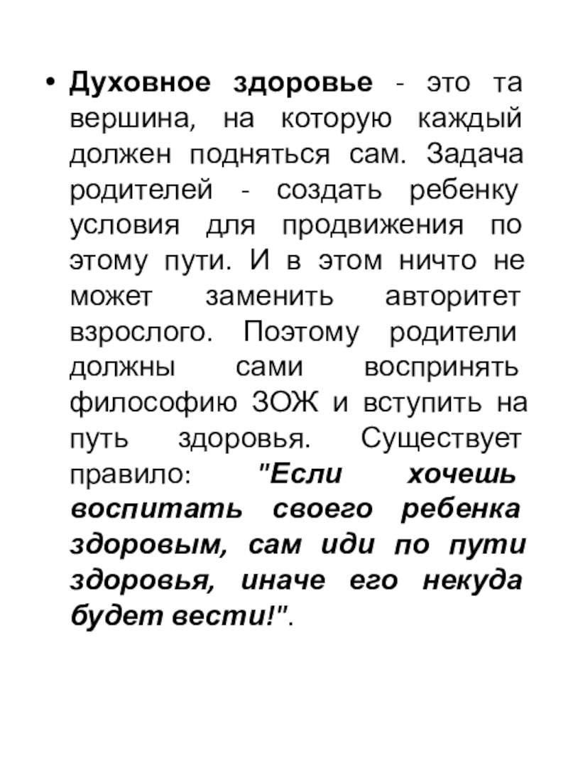 сам. Задача родителей - создать ребенку условия для продвижения по этому пути. И в этом ничто не может заменить авторитет взрослого. Поэтому родители должны сами воспринять философию ЗОЖ и вступить на путь здоровья. Существует правило: "Если хочешь воспитать своего ребенка здоровым, сам иди по пути здоровья, иначе его некуда будет вести!".