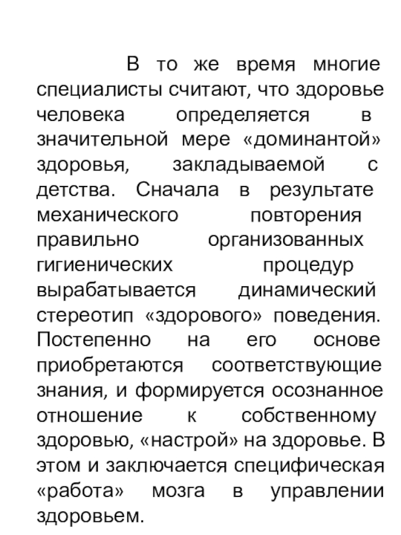 что здоровье человека определяется в значительной мере «доминантой» здоровья, закладываемой с детства. Сначала в результате механического повторения правильно организованных гигиенических процедур вырабатывается динамический стереотип «здорового» поведения. Постепенно на его основе приобретаются соответствующие знания, и формируется осознанное отношение к собственному здоровью, «настрой» на здоровье. В этом и заключается специфическая «работа» мозга в управлении здоровьем.