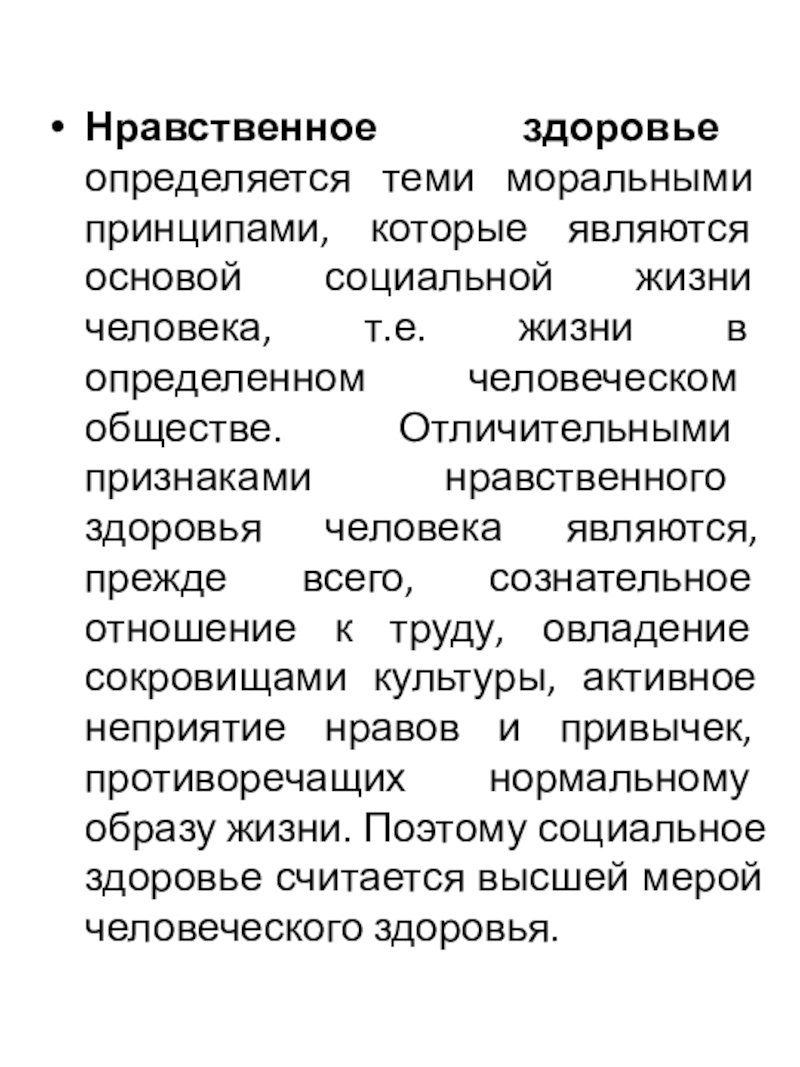 человека, т.е. жизни в определенном человеческом обществе. Отличительными признаками нравственного здоровья человека являются, прежде всего, сознательное отношение к труду, овладение сокровищами культуры, активное неприятие нравов и привычек, противоречащих нормальному образу жизни. Поэтому социальное здоровье считается высшей мерой человеческого здоровья.
