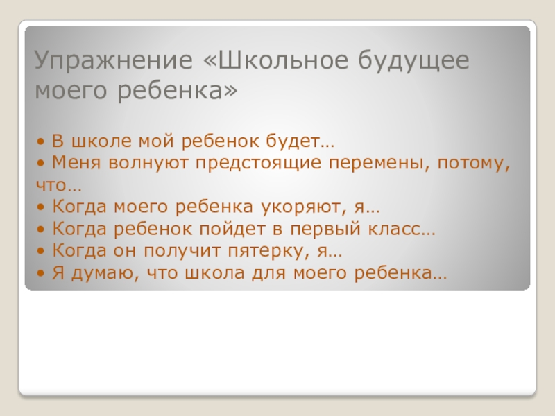 Слайд 17Упражнение «Школьное будущее моего ребенка»