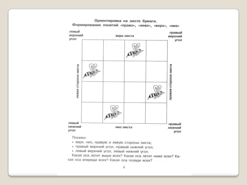 • Свободно ориентироваться в пространстве и на листе бумаги (правая—левая сторона, верх—низ и т. д.).