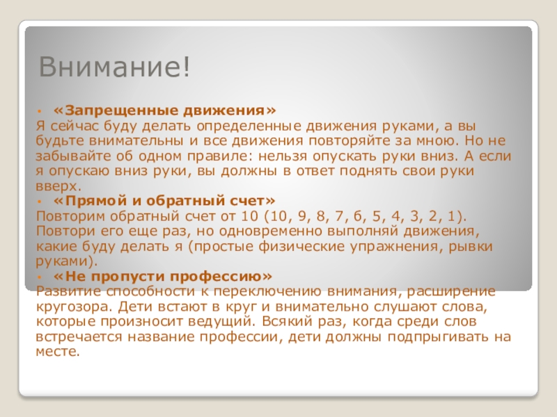 Развитие способности к переключению внимания, расширение кругозора. Дети встают в круг и внимательно слушают слова, которые произносит ведущий. Всякий раз, когда среди слов встречается название профессии, дети должны подпрыгивать на месте.