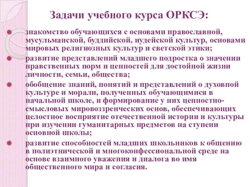 Задачи учебного курса ОРКСЭ:
