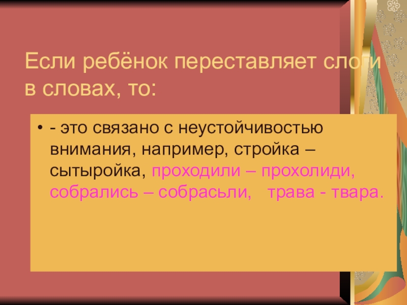Слайд 36Если ребёнок переставляет слоги в словах, то: