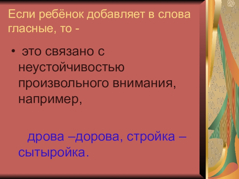 Слайд 37Если ребёнок добавляет в слова гласные, то -