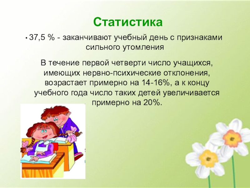 4.После школы ребенок должен отдохнуть не менее 1,5 часа (пообедать, погулять) и потом приступить к выполнению заданий. Оптимальная работоспособность - с 16 до 18 часов.