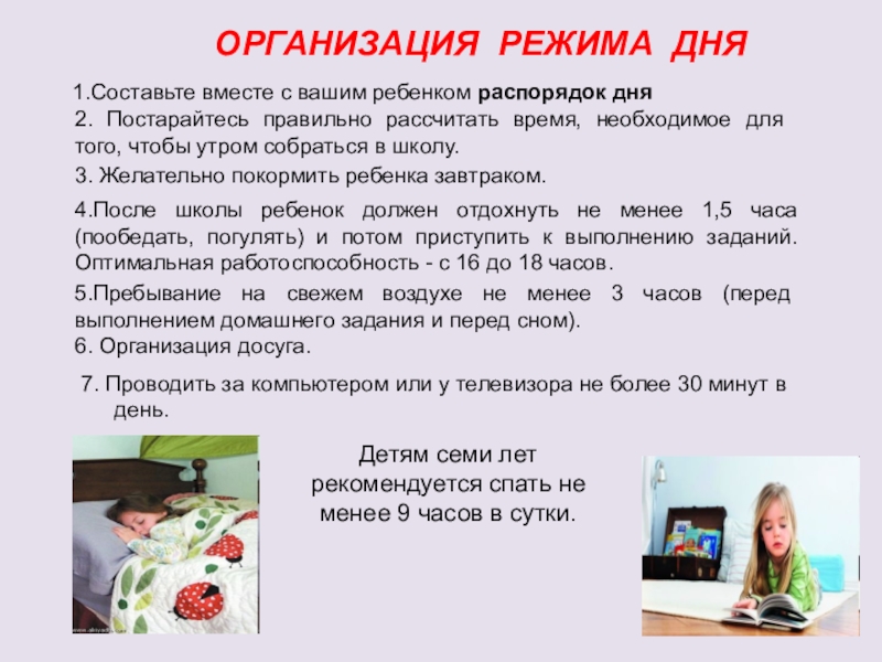 Детям семи лет рекомендуется спать не менее 9 часов в сутки.