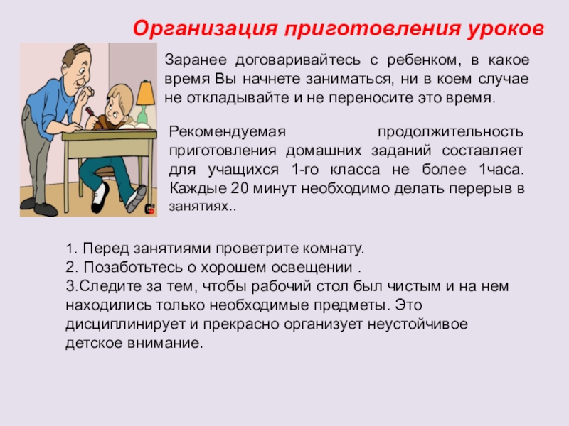 Рекомендуемая продолжительность приготовления домашних заданий составляет для учащихся 1-го класса не более 1часа. Каждые 20 минут необходимо делать перерыв в занятиях..