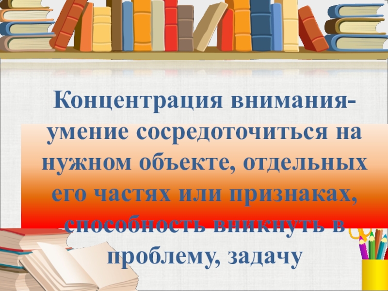 Слайд 5Концентрация внимания- умение сосредоточиться на нужном объекте, отдельных его частях или