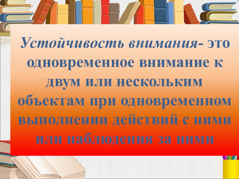 Слайд 7Устойчивость внимания- это одновременное внимание к двум или нескольким объектам при