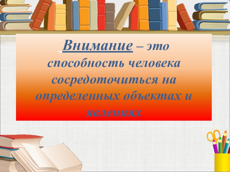 Слайд 3 Внимание – это способность человека сосредоточиться на определенных объектах и