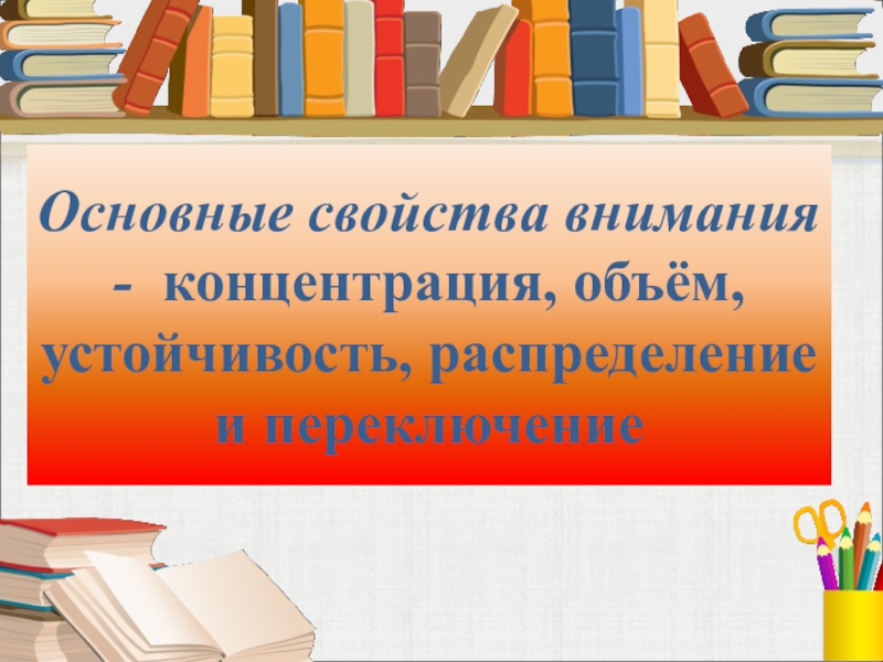 Слайд 4Основные свойства внимания - концентрация, объём, устойчивость, распределение и переключение