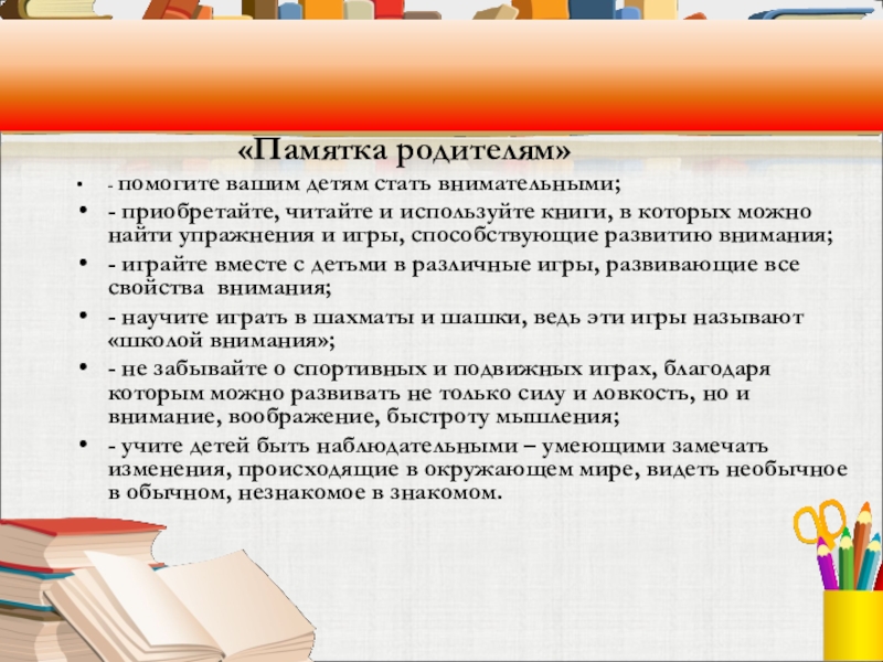 - приобретайте, читайте и используйте книги, в которых можно найти упражнения и игры, способствующие развитию внимания;