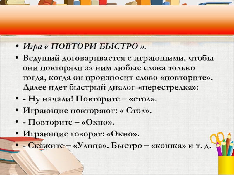за ним любые слова только тогда, когда он произносит слово «повторите». Далее идет быстрый диалог-«перестрелка»: