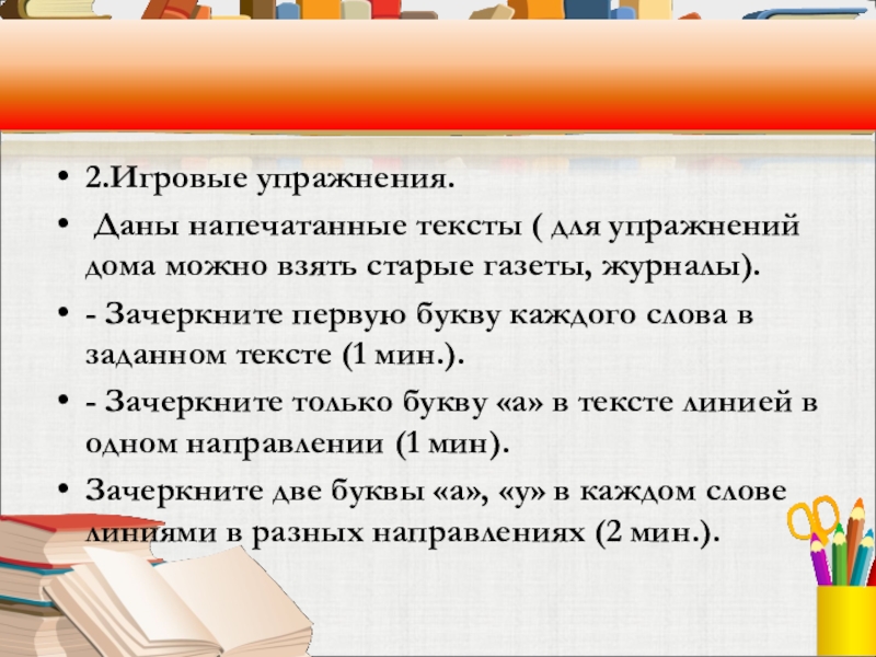 Зачеркните две буквы «а», «у» в каждом слове линиями в разных направлениях (2 мин.).