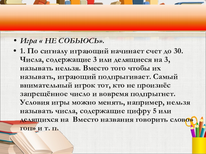 Числа, содержащие 3 или делящиеся на 3, называть нельзя. Вместо того чтобы их называть, играющий подпрыгивает. Самый внимательный игрок тот, кто не произнёс запрещённое число и вовремя подпрыгнет. Условия игры можно менять, например, нельзя называть числа, содержащие цифру 5 или делящихся на Вместо названия говорить слово»гоп» и т. п.