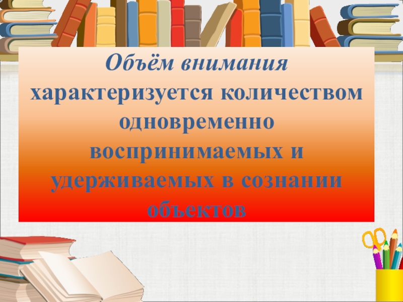 Слайд 6Объём внимания характеризуется количеством одновременно воспринимаемых и удерживаемых в сознании объектов