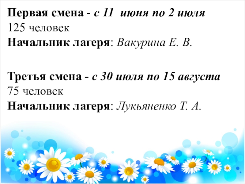Начальник лагеря: Лукьяненко Т. А.