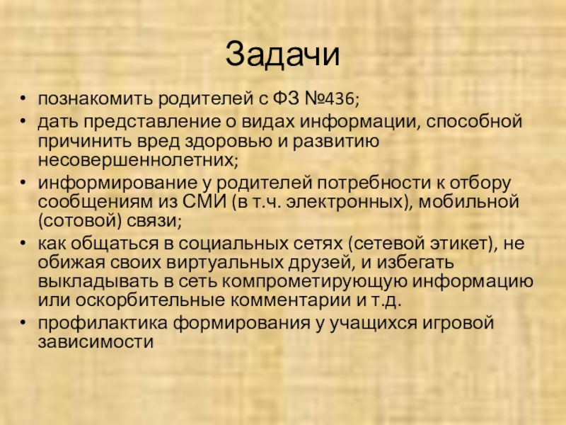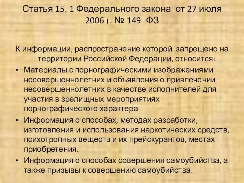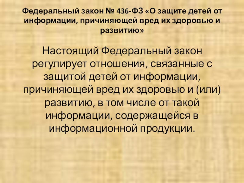 Настоящий Федеральный закон регулирует отношения, связанные с защитой детей от информации, причиняющей вред их здоровью и (или) развитию, в том числе от такой информации, содержащейся в информационной продукции.