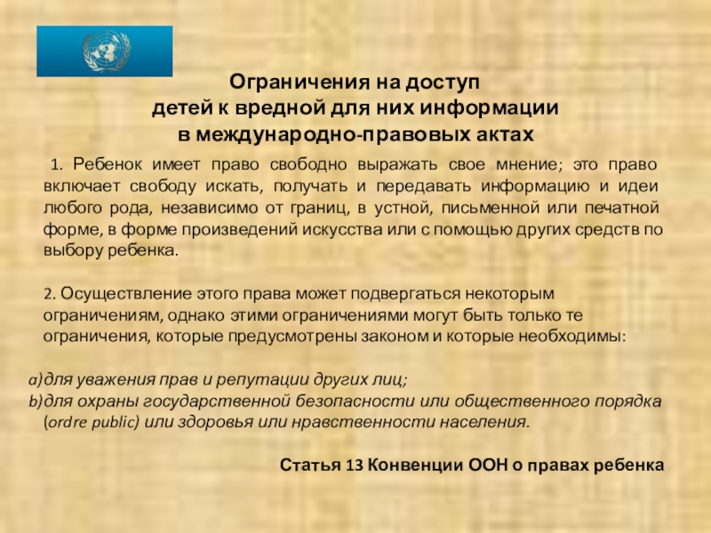 1. Ребенок имеет право свободно выражать свое мнение; это право включает свободу искать, получать и передавать информацию и идеи любого рода, независимо от границ, в устной, письменной или печатной форме, в форме произведений искусства или с помощью других средств по выбору ребенка.
