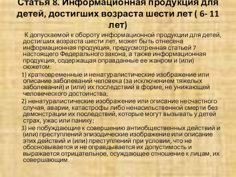 К допускаемой к обороту информационной продукции для детей, достигших возраста шести лет, может быть отнесена информационная продукция, предусмотренная статьей 7 настоящего Федерального закона, а также информационная продукция, содержащая оправданные ее жанром и (или) сюжетом: