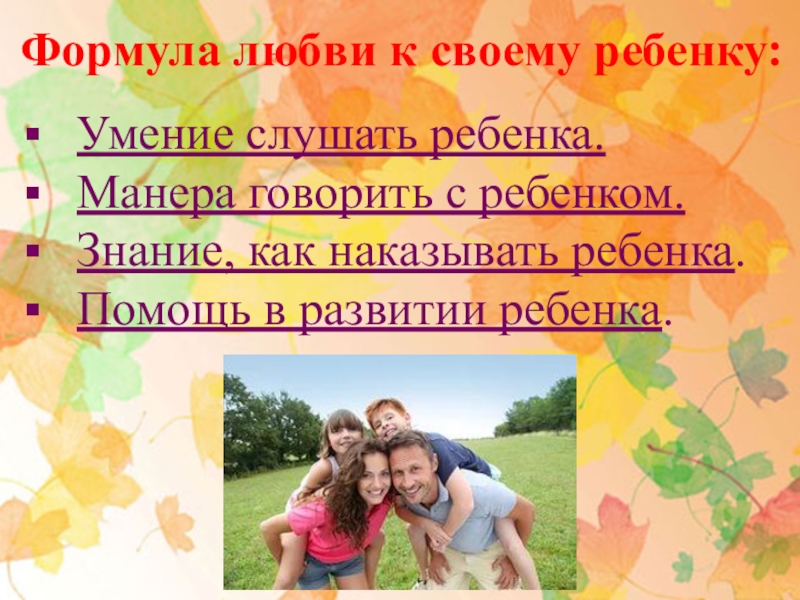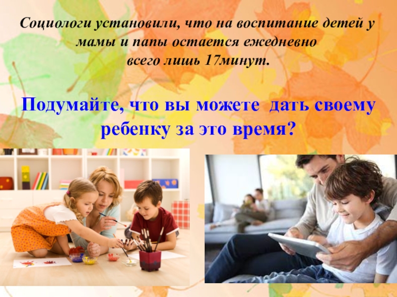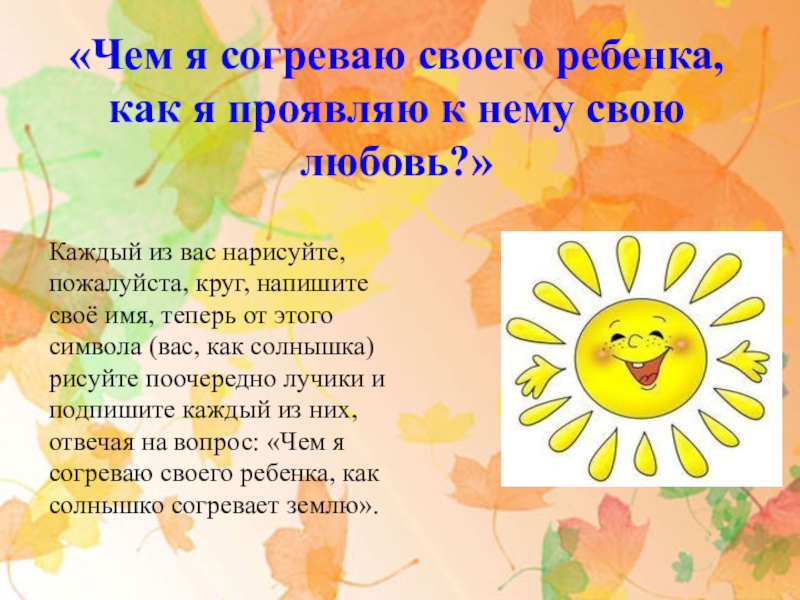 Каждый из вас нарисуйте, пожалуйста, круг, напишите своё имя, теперь от этого символа (вас, как солнышка) рисуйте поочередно лучики и подпишите каждый из них, отвечая на вопрос: «Чем я согреваю своего ребенка, как солнышко согревает землю».