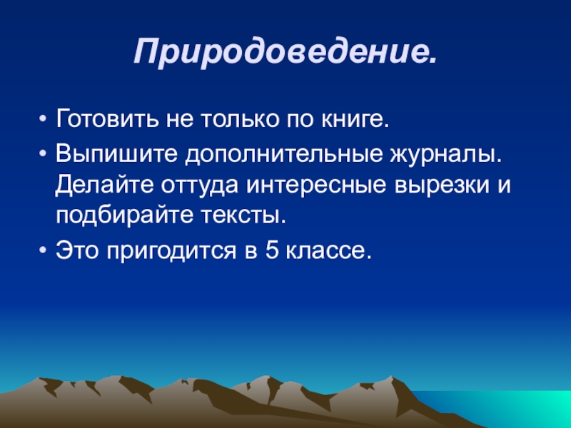 Природоведение.Готовить не только по книге. Выпишите дополнительные журналы. Делайте оттуда интересные вырезки и подбирайте тексты. Это пригодится
