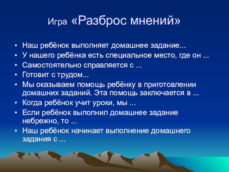 Игра «Разброс мнений»Наш ребёнок выполняет домашнее задание...У нашего ребёнка есть специальное место, где он ...Самостоятельно справляется с