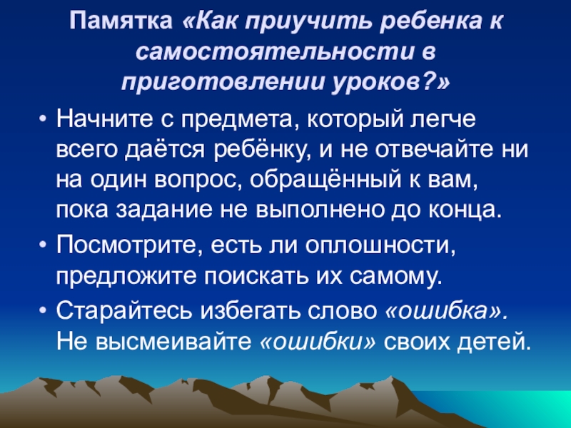 Слайд 7Памятка «Как приучить ребенка к самостоятельности в приготовлении уроков?»