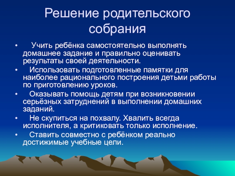 Решение родительского собрания  Учить ребёнка самостоятельно выполнять домашнее задание и правильно оценивать результаты своей деятельности.
