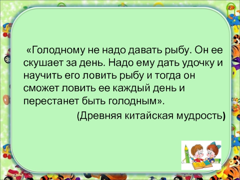 «Голодному не надо давать рыбу. Он ее скушает за день. Надо