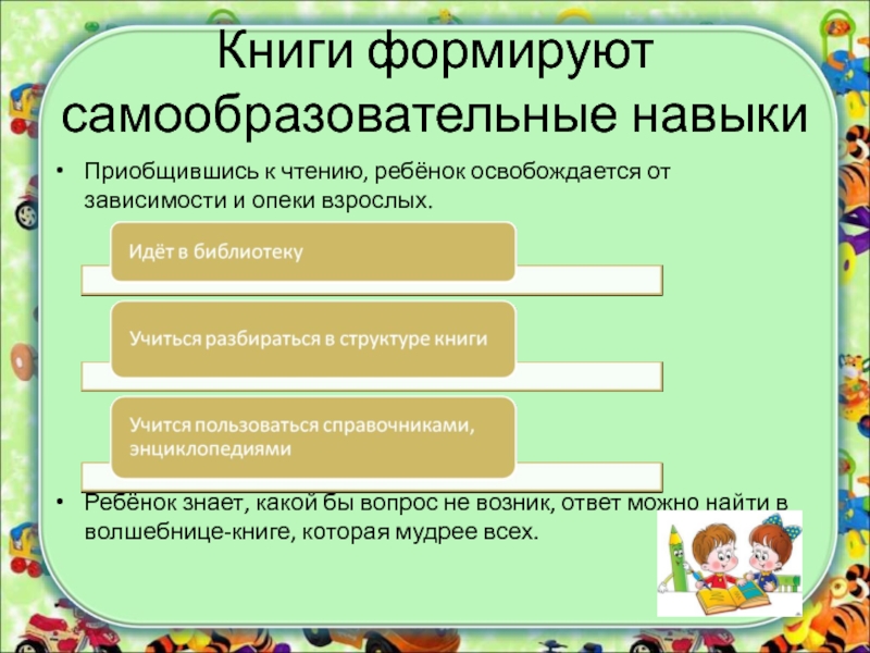 Ребёнок знает, какой бы вопрос не возник, ответ можно найти в волшебнице-книге, которая мудрее всех.