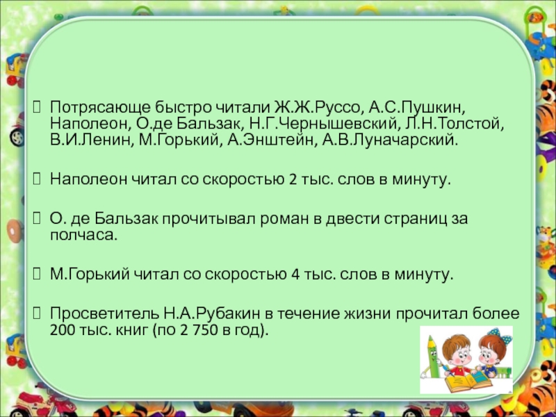 Потрясающе быстро читали Ж.Ж.Руссо, А.С.Пушкин, Наполеон, О.де Бальзак, Н.Г.Чернышевский, Л.Н.Толстой, В.И.Ленин,