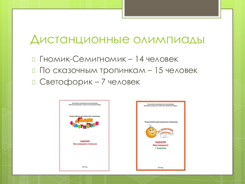 Дистанционные олимпиадыГномик-Семигномик – 14 человекПо сказочным тропинкам – 15 человекСветофорик – 7 человек
