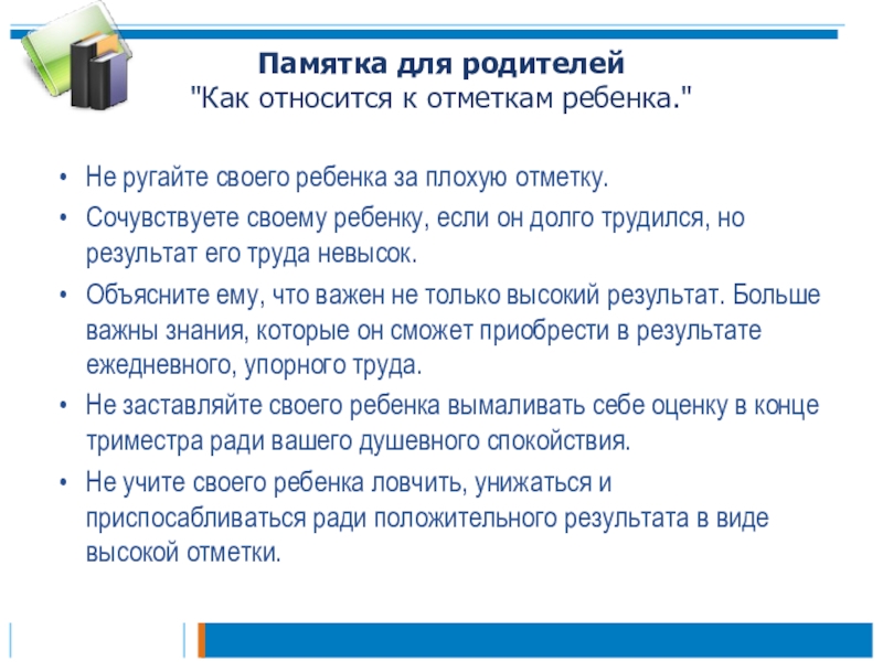 Пусть ребенок получает хорошую отметку ради того, чтобы его отметили. Вскоре это станет привычкой. Демонстрируйте положительные результаты своего труда, чтобы ребенку хотелось вам подражать.